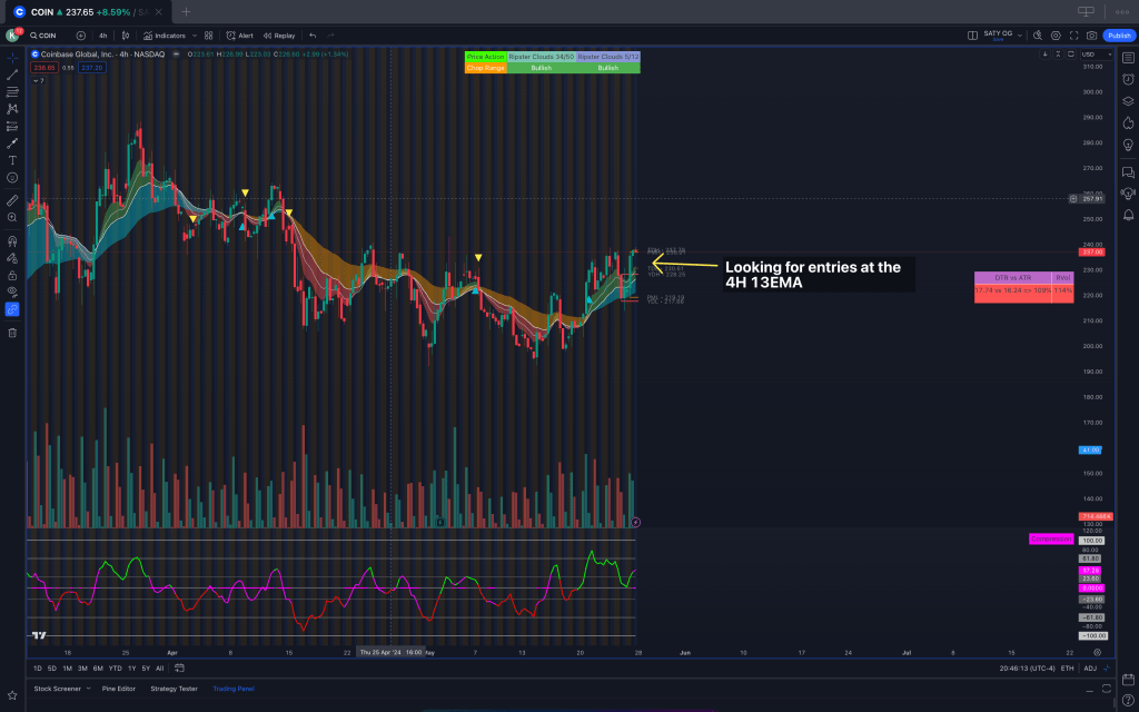 The 4Hour time frame is where we will aim to time our entries, there are two entry points here, and early entry with bullish price action on the day will be the 13 EMA, but with more drawdown on the name we can test the 21/48EMA and these are valid entries as well. If taking position at 13EMA its important to recognize you should size down, as the retest down to the 48EMA is completely valid.