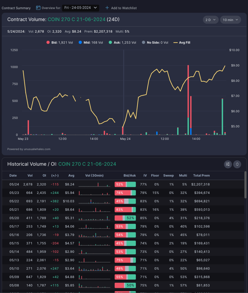 Personally, I’ll be aiming for the 350C June 21st for a day trade, and then extend these further if the price action aligns with the thesis. Consequently, the Coin remains an appealing and potentially profitable focus for traders.