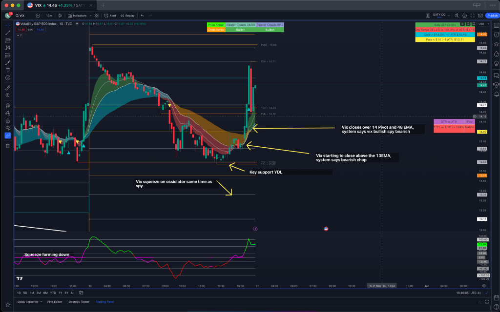 The VIX plays a crucial role in confirming market sentiment. Today, both SPY and VIX exhibited simultaneous squeezes on the 10-minute chart, indicating correlated price action. VIX closing above its bearish 13 EMA suggested a bullish transition for VIX, while SPY closing below its bullish 13 EMA confirmed a bearish transition for SPY.