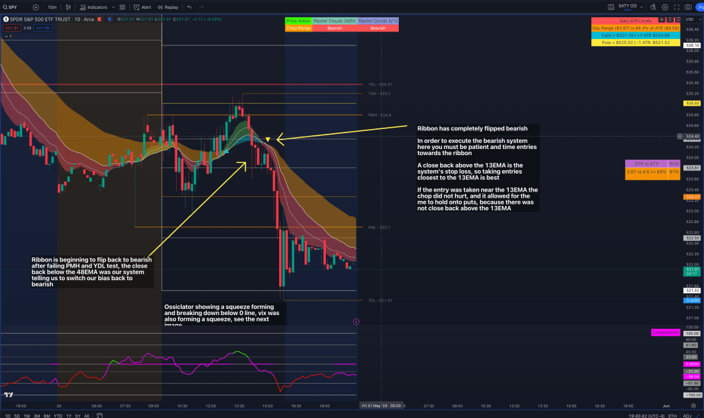Our analysis is conducted on the 10-minute chart, which provides timely insights for intra-day trades. Today, SPY opened with a gap down and attempted to fill this gap during the day. However, it failed to breach the Pre Market High (PMH) and Yesterday’s Low (YDL), signaling a potential trend reversal. The ribbon confirmed this by switching back to bearish after SPY closed below the 48 EMA of the bullish cloud structure.