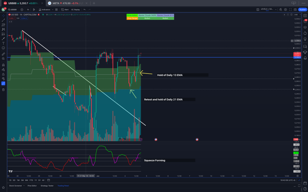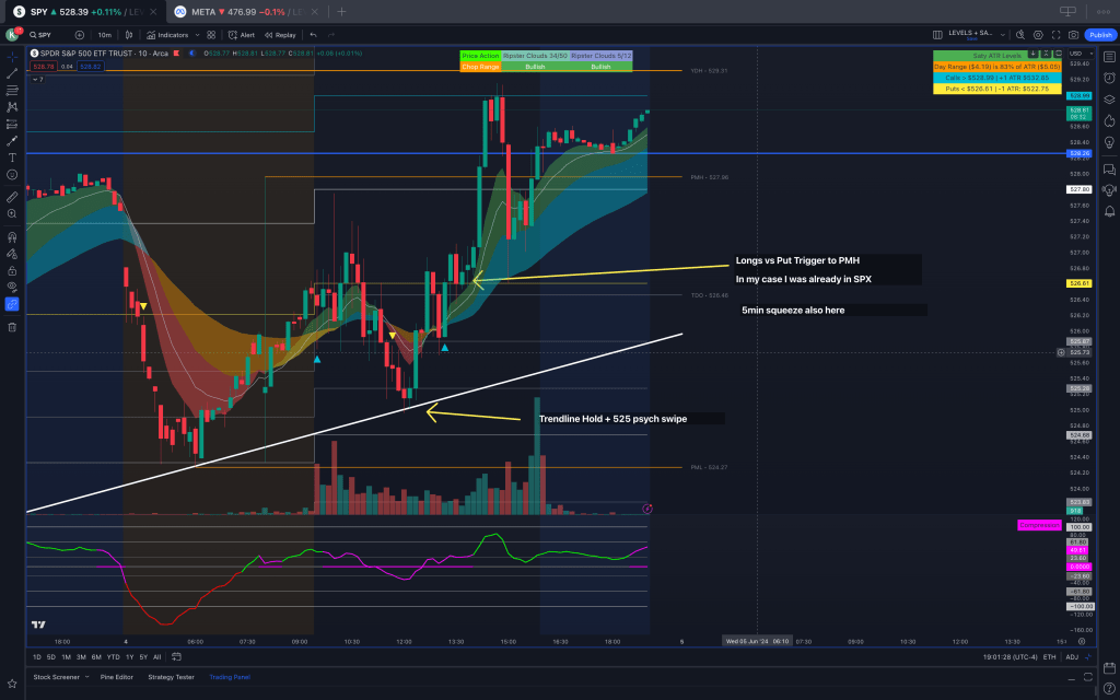 During the same time of the VIX squeeze forming we saw SPY reclaim its 10M trend after bouncing off of a premarket trendline. When we see VIX and SPY having squeeze’s at the same time, in opposite directions, especially given the price action on the hourly time frame, we can confidently take longs vs the put trigger level or the 13EMA of the 10M ribbon. I like to execute these with SPX 2DTE which went 100%+.
