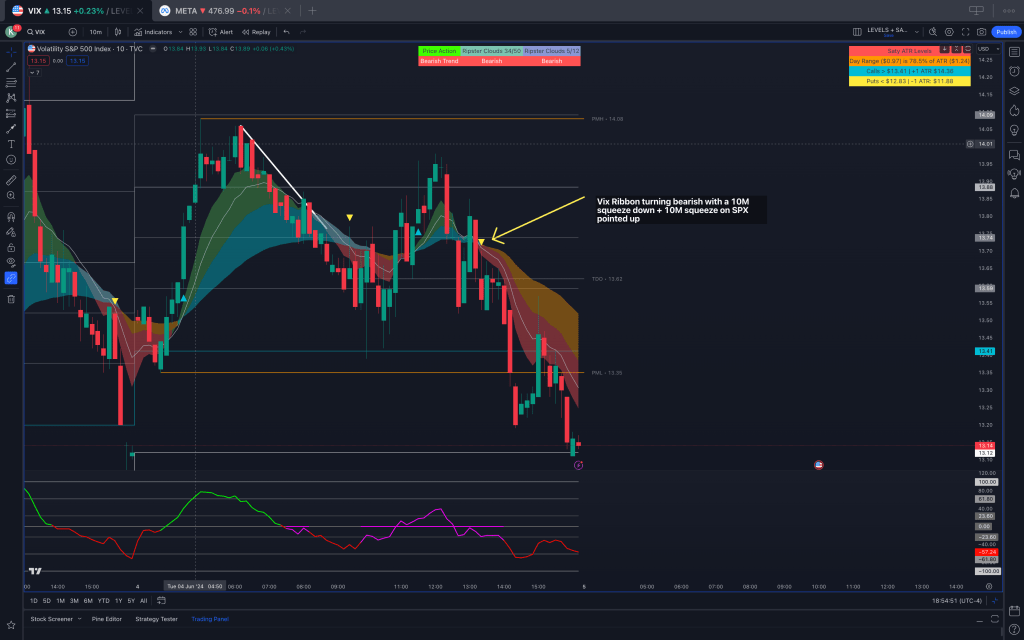 The morning began with choppy action which was expected given that the overnight session had such a large move, often times when the overnight move has lots of range we can expect the beginning of the New York session to see some form accumulation/chop period. VIX attempted to turn bullish and push towards 14 where it began to fail. The ribbon ultimately flipped bearish with a 10M squeeze on the oscillator pointing down.
