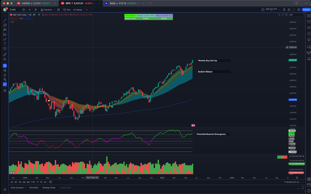 On the weekly time frame we continue to see bullish structure remain with the EMA clouds. We saw a break of last week’s highs via the CPI move that pushed us to all time highs. I would like to note that there is a potential bearish divergence on the Phase Oscillator which can indicate a potential pull back to the ribbon, however this is only one bearish signal on the chart, amongst many bullish signals for continuation.