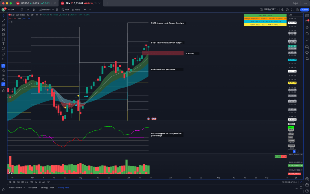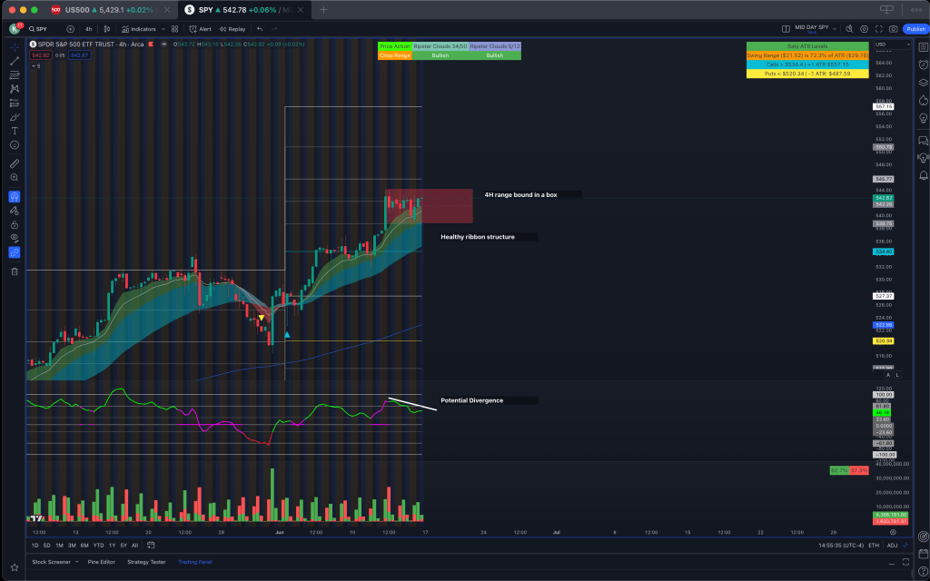 On the daily time frame we continue to see bullish cloud structure remain. It should be notes that once again there is a potential bearish divergence on the daily time frame with the phase oscillator failing to make new highs despite price making new highs. We have the CPI gap looming below, which with a gap fill would be a very healthy retest of the daily EMA’s. The upside move for the rest of the month is capped at +1 ATR which is 5575.