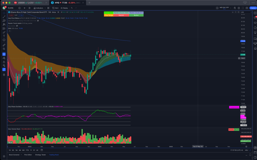 HYG on the weekly time frame remains to have to bullish structure but once again the pivot of 77-78 must be broken for us to continue to see that investors have an appetite for risk.
