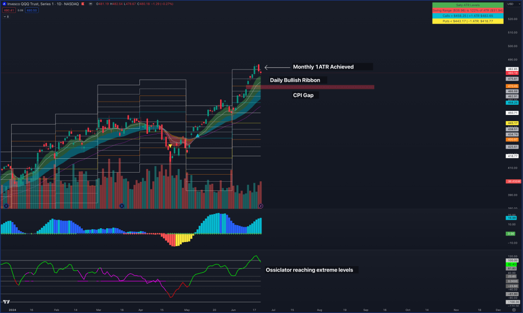 This week we achieved +1 ATR for the month of June and began rejecting that level going into OPEX Friday. Viewing the ribbon we are still in a short term and longterm up trend with the EMA’s remaining all stacked to the upside, indicating continuation of bullish momentum.