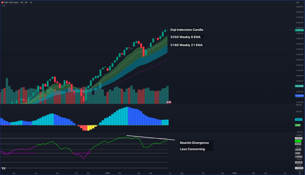 This week, we observed an interesting candle on the weekly chart with a long upper wick. The price failed to sustain the breakout above the all-time high of 5500, closing within the range of the previous week’s candle. This is often referred to as a DOJI or an indecision candle, indicating that neither buyers nor sellers could take control. Typically, this signals a potential pullback for a weekly mean reversion.