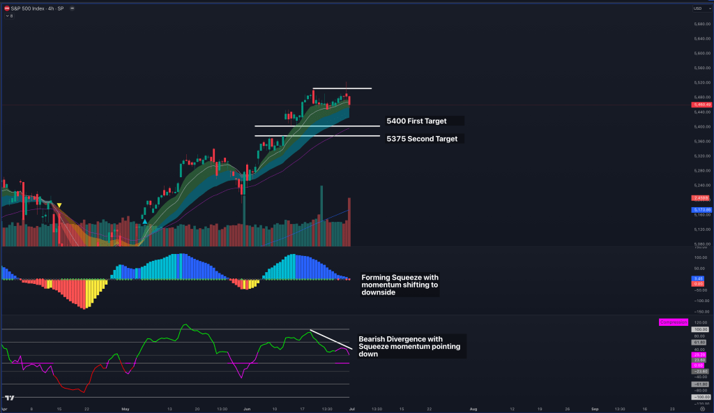 Two main zones of interest for a pullback are 5400, aligning with the 21EMA and the top of our CPI gap, and 5375, our gap fill target coinciding with the 34EMA. These zones are critical for support as buyers are expected to step in.