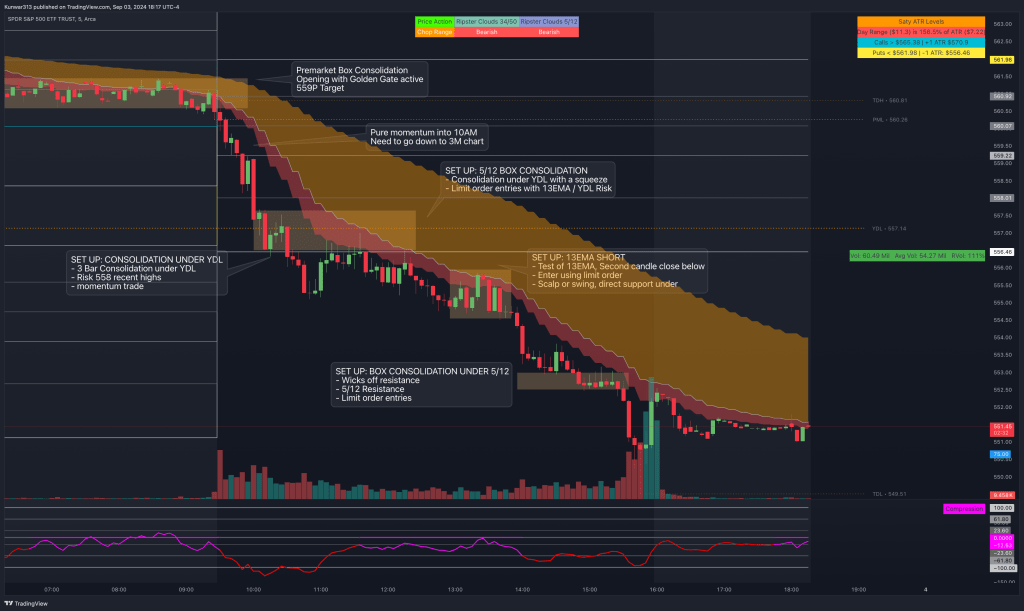 SPY opened with a GAP DOWN under the call trigger and activated golden gate immediatley Amateur move scalps to the downside would have worked, but its the opening bell of monday, it is better to be cautious 10AM held trend going to the downside and completed the golden gate 3M SPX SCALPS IN MOMENTUM WERE OKAY After the second leg down after 10AM we consolidated at 1ATR and YDL